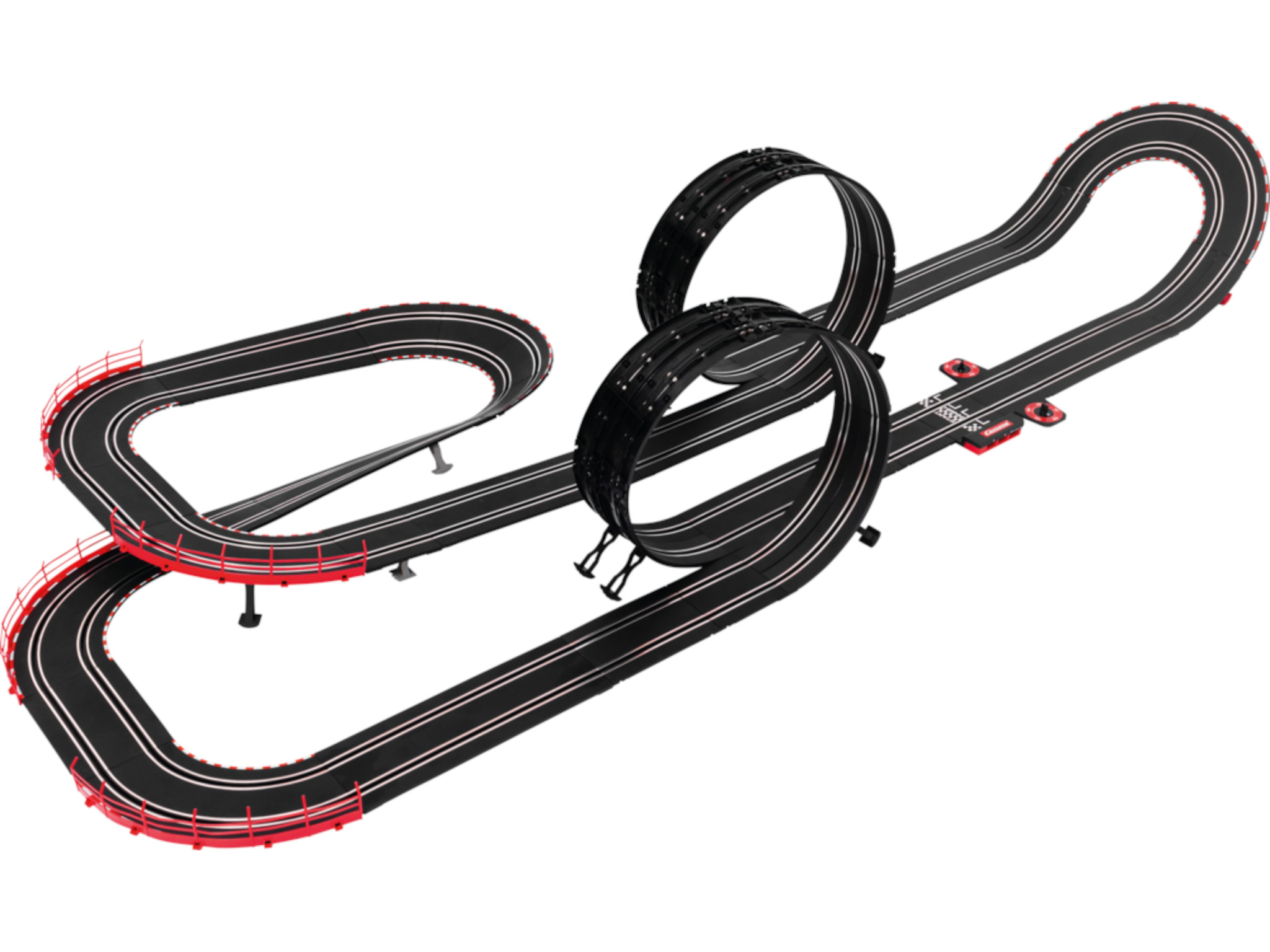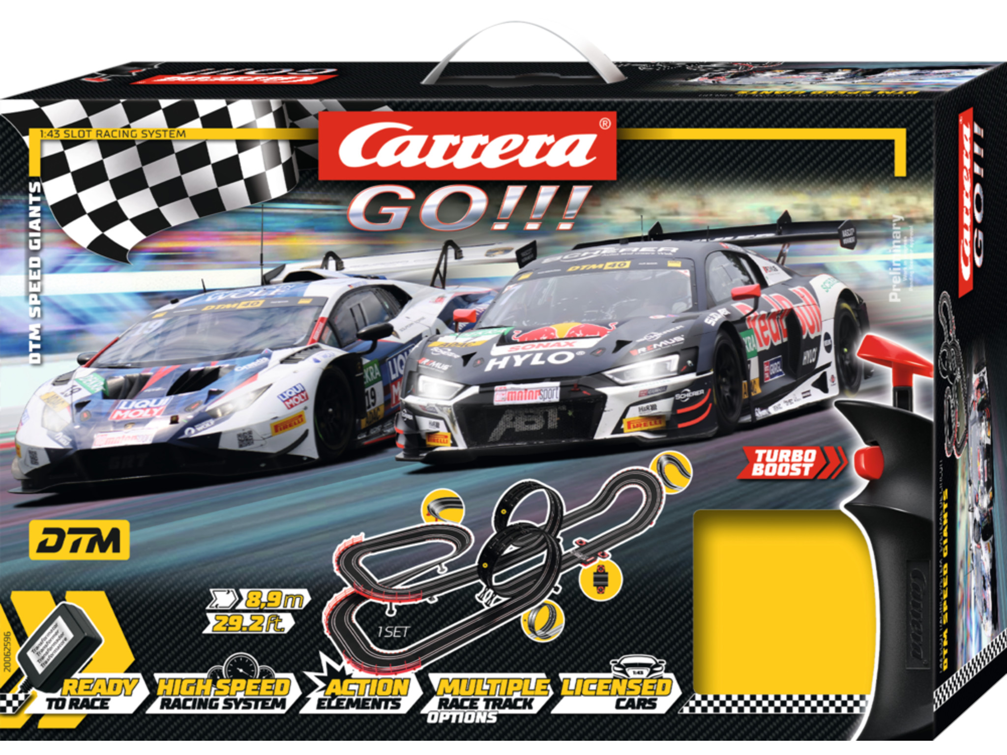 Mit dem Carrera GO!!! Set „DTM Speed Giants” wird die Rennstrecke zum Schauplatz packender Duelle. Auf 8,9 Metern mit 2 Loopings, Steilkurven und einem spektakulären Fly-Over liefern sich der Audi R8 LMS GT3 evo II DTM “ABT, R. Feller, No.7” und der Lamborghini Huracán GT3 EVO2 “Luca Engstler, No.19” heiße Rennen. Die Turbo-Handregler ermöglichen es, auf den Highspeed- Strecke jede Herausforderung zu meistern, während das Timing beim Durchfahren der Loopings den entscheidenden Vorteil verschafft. Mit den originalgetreuen Fahrzeugen im Maßstab 1:43 erleben die Spieler intensives Rennsport-Feeling und spüren den Nervenkitzel, wenn sie sich in actiongeladenen Duellen messen.