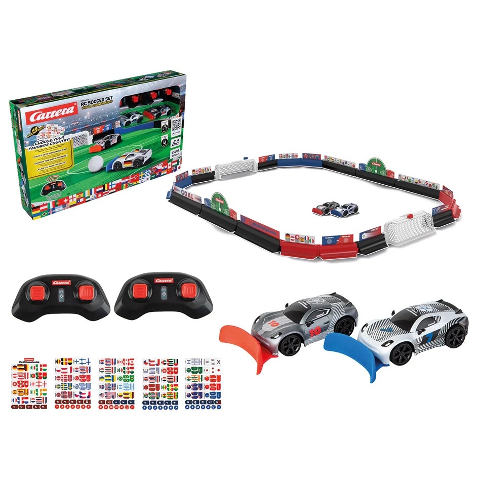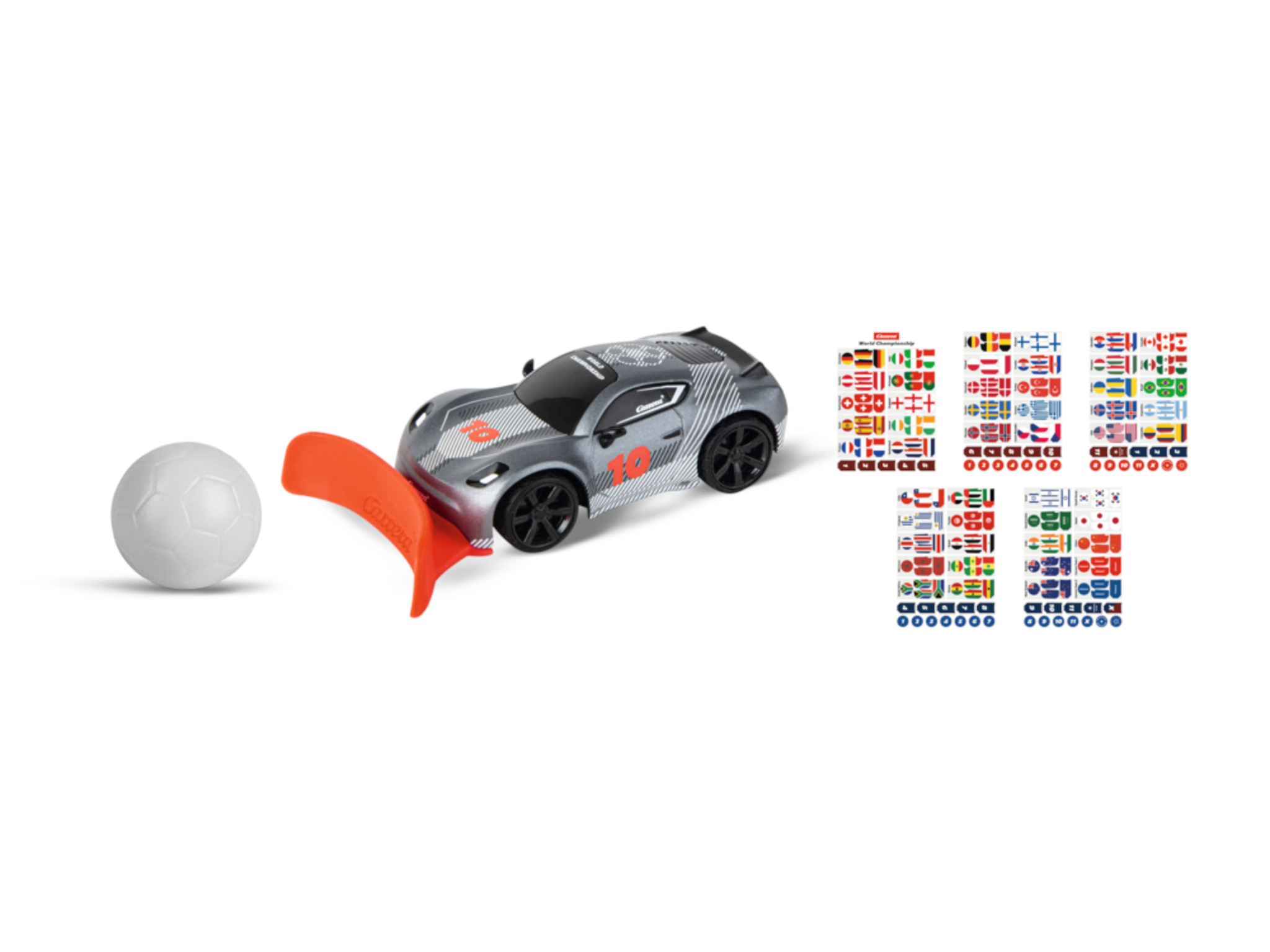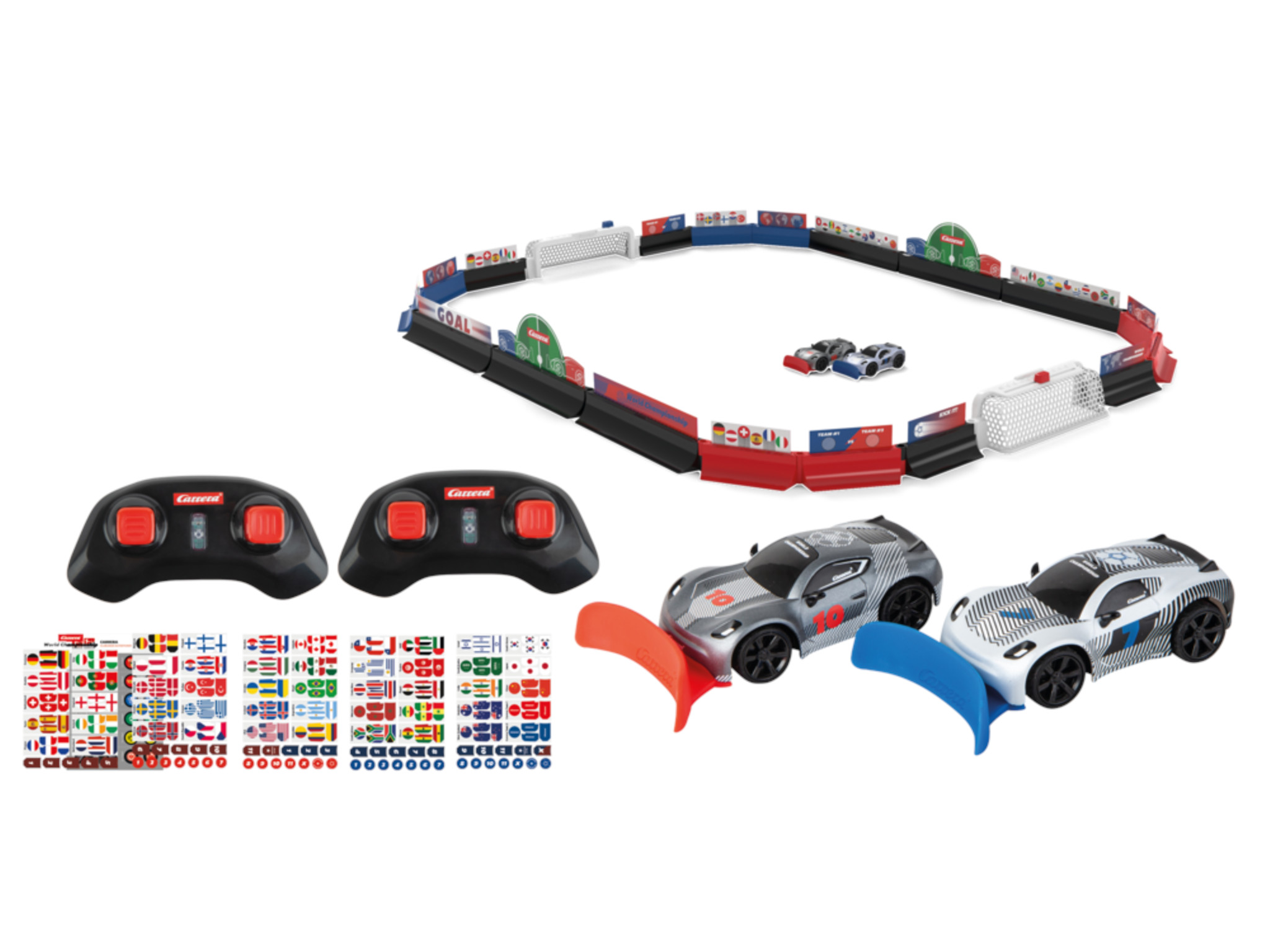 Mit dem Carrera RC Soccer Set World Championship zieht echtes Turnierfeeling bei dir zu Hause ein. Sobald das Spielfeld aufgebaut ist, wird das Wohnzimmer zur internationalen Fußballarena. Zwei ferngesteuerte Fahrzeuge kämpfen um den Ball und sorgen zusammen mit den Toren, Torzählern und Deko Elementen für spannende Duelle mit echtem WM Flair.